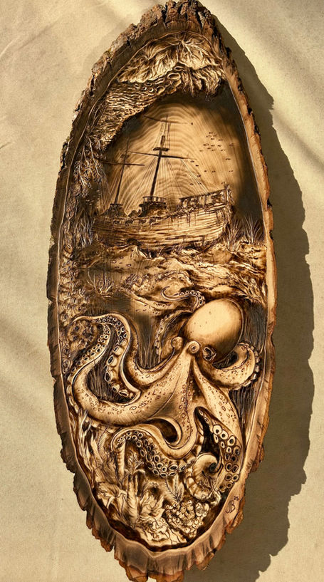 All digital works are hand drawn by the artist using an iPad Pro and Apple Pencil with a studio program. All pyrography pieces are burned, stained and/or painted.